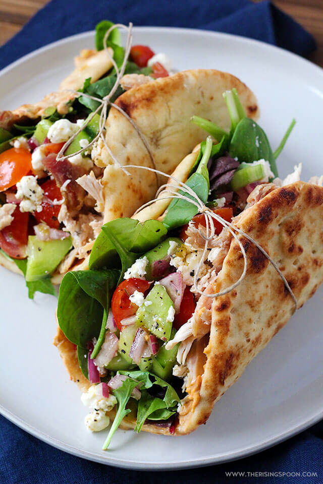 Hummus | An easy chicken wrap recipe you can throw together in just 15 minutes for a quick & healthy dinner or lunch. Featuring simple ingredients like shredded chicken, hummus, chopped fresh veggies, a homemade red wine vinaigrette, and crumbled cheese all piled onto a piece of soft & chewy naan bread (Indian flatbread). Fix this on a busy weeknight or prep it for the week ahead for grab & go meals.
