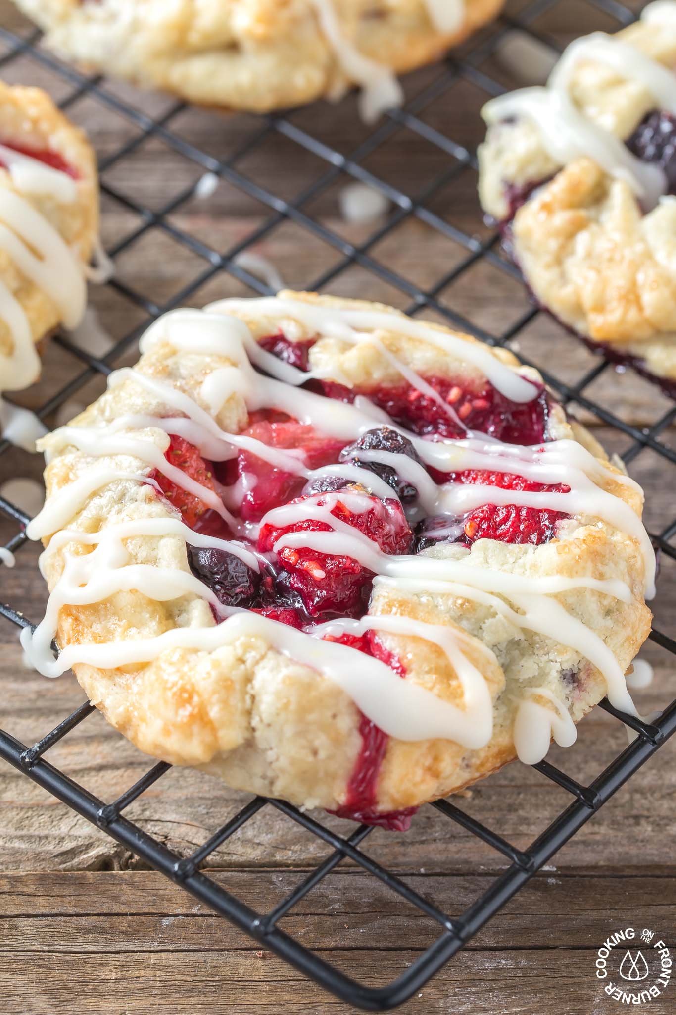 Triple Berry | These mini triple berry galettes are easy to make, use fresh berries, a pre-made pie crust and drizzled with a tangy lemon glaze.