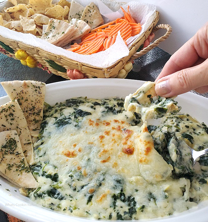 Spinach | One of the most popular hot dips in many restaurants is this baked artichoke and spinach dips. Great for parties and perfect for happy hour! Served with vegetables, chips or garlic bread everyone will rave and ask for this for every event.