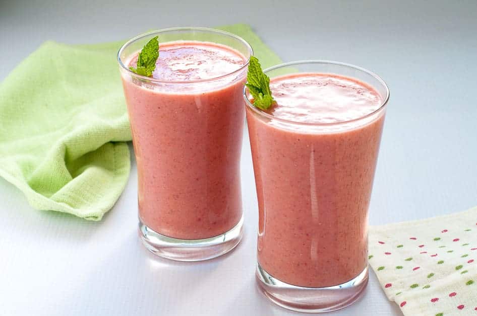 Strawberry Rhubarb | A healthy rhubarb smoothie made with non-dairy milk and chia seeds, naturally sweetened with strawberries and bananas.