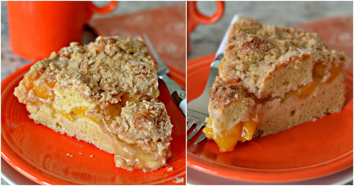 Coffee Cake | This Peach Coffee Cake has a sour cream cake base, peach center and crunchy crumb oatmeal topping. It is a family favorite and is perfect for brunch and holidays.