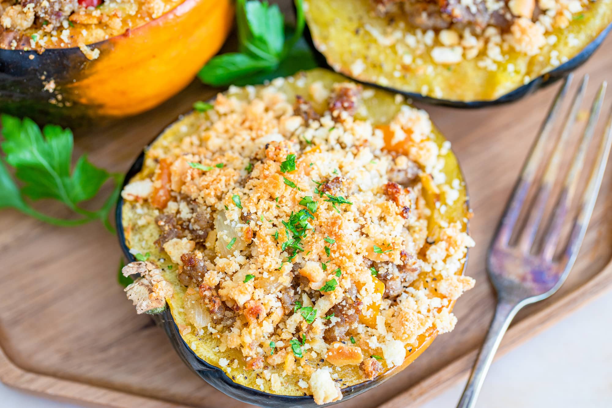 #Sausage Stuffed | Acorn squash stuffed with sausage, bread crumbs (keto version too!), cheese, and loaded with herbs and spices that your whole family will love!