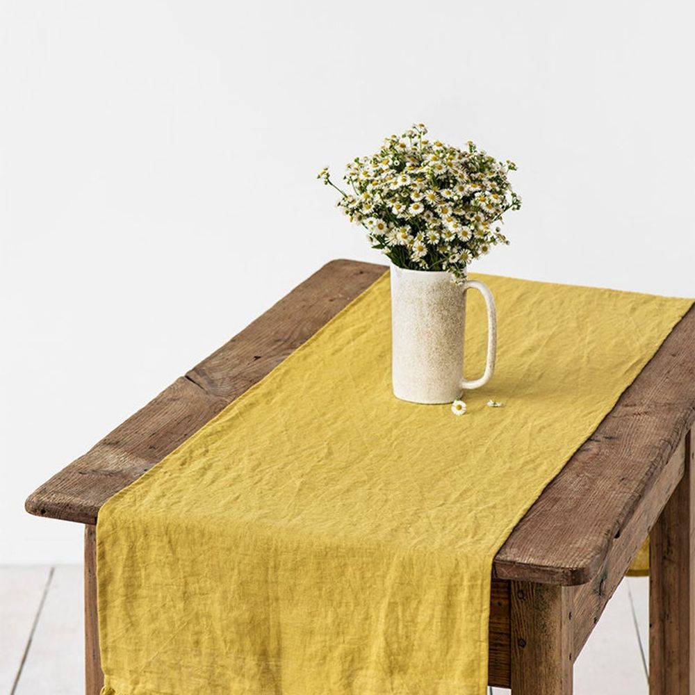 #Table Runner | Ruffled linen table runner in Moss Yellow – MAGIC LINEN: request quotes, estimates, prices or catalogues online through MOM, your B2B digital platform dedicated to decor, design and lifestyle professionals.