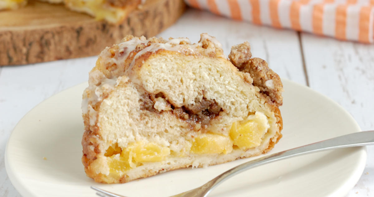 #Streusel Coffee Cake | Peach Coffee Cake made with yeast dough & layered with pecan streusel & peaches. Learn the special technique to create distinct layers of peach & streusel.